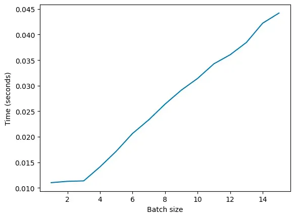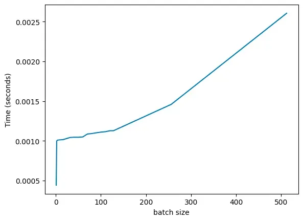 从图中可以看到,batch size 从 1 到 3 时,所消耗的时间并不会增加。但是,一旦 batch size 超过 3,时间消耗就会呈线性增长。
