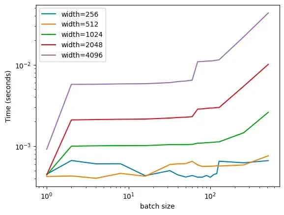 尽管数据中存在一些噪声干扰,但总体趋势与我们的预测一致:推理时间在接近 128 的阈值时开始急剧增加(在此,我们采取逐步加倍的方式来观察和记录不同 batch size 对推理时间(inference time)的影响)。如果我们改变 MLP 层的宽度,会发现这一现象在多种架构中都存在(下面是一张对数-对数(log-log)坐标图,以便所有的数据点都能在图表中清晰地显示)。