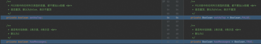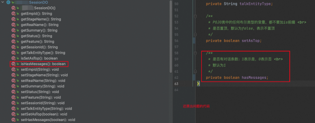 给mysql加好字段了,咱还得给 xxxDO 加上字段,按照上面的说法“POJO类中的任何布尔类型的变量,都不要加is前缀”,那就这么写:
