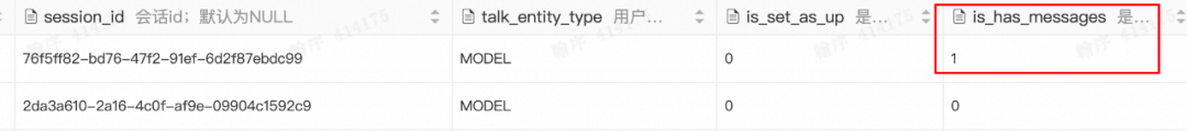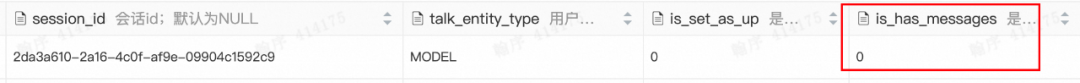 因此,“是否有对话条数”的字段名为 is_has_messages,数据类型为:unsigned tinyint(1表示是,0表示否;默认为1)