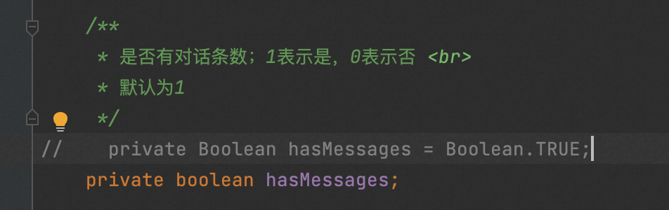 /*** 是否有对话条数;1表示是,0表示否 <br>* 默认为1*/private boolean hasMessages;
