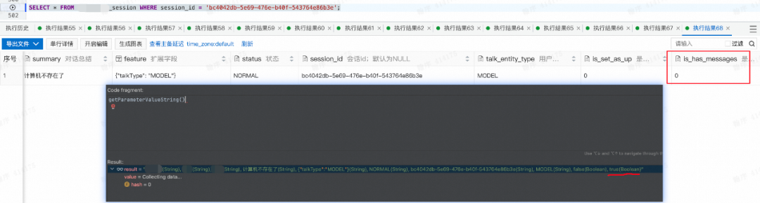 我们的注意力都放在addSession接口了,在debug了Mybatis的源码时,非常肯定确认插入db的时候,is_has_messages的值一定是true。为什么有时候is_has_messages的值一会儿是1,一会儿又是0呢?