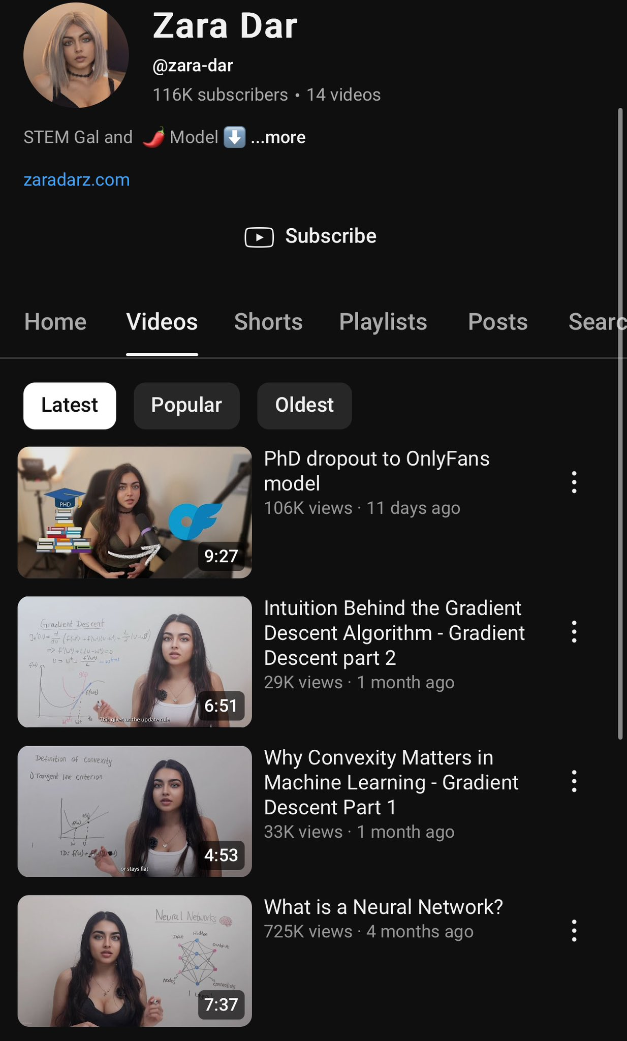 看了一下,最早她在油管开频道,讲的是神经网络、机器学习、梯度下降,播放量也不低。