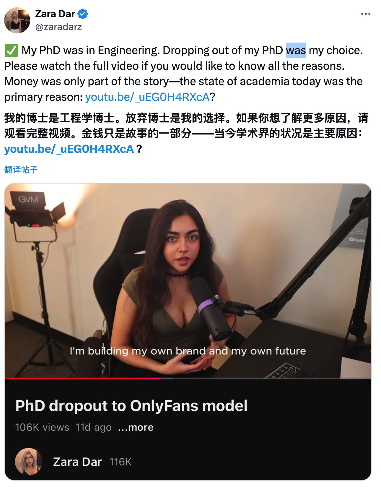 这两天 X 上有一个热搜。一个名叫扎拉 - 达尔(Zara Dar)的在读博士(拥有计算机和生物学位),退了学位,全职经营 OnlyFans。