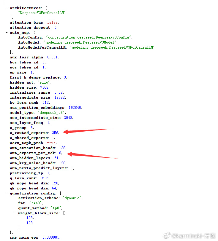 通过配置文件可以看到,总计有256个专家,每个token激活8个。假设每个专家大小一致,那么每个专家就是2.6875GB, 8个专家是21.5GB!假设问题非常内聚,能在16个专家以内完成,那么这就意味着其实激活两跟70B-4bit模型差不多。DeepSeek-V3将很可用。如果量化到4bit,可能会产生质的变化了。(考验存储性能的时刻到了!建议存储性能不要低于10GB/s的读取速度,这样就能在2秒左右完成8个专家的加载了。)