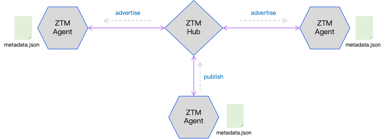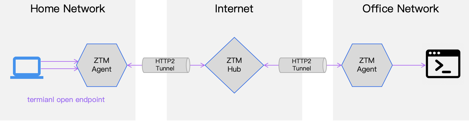 - ZTM Agent:部署在需要接入零信任网络的设备上,包括个人计算机、服务器或边缘设备上,用于发起加密隧道,将设备的流量安全地转发到 ZTM Hub。