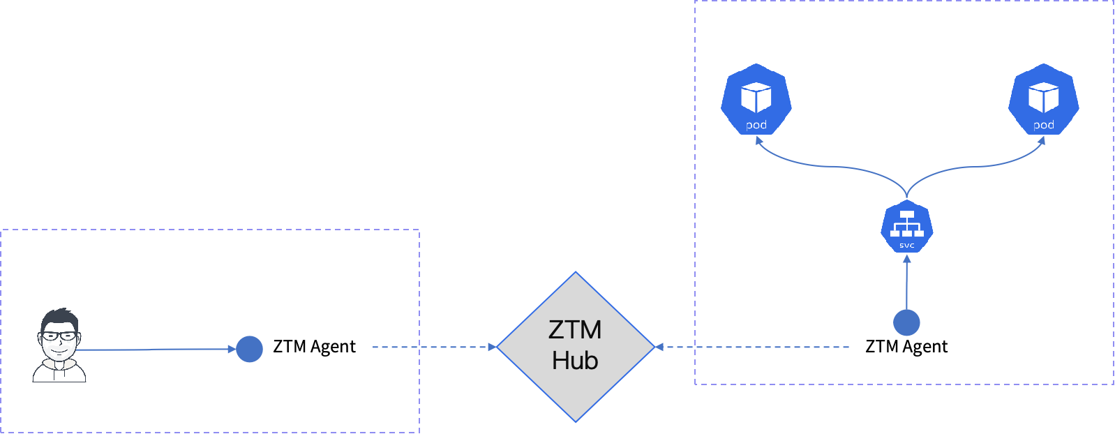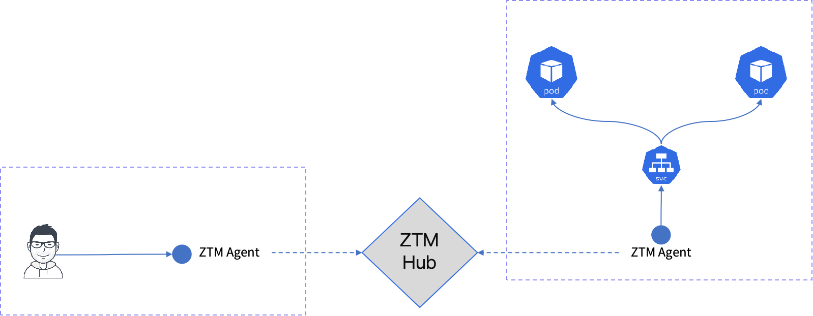借助 ZTM Hub,我们可以在集群内外部署 ZTM Agent,打通与集群的连通性。这样即使在两个隔离的网络,我们也能通过 ZTM 的 HTTP/2 隧道到访问集群内的服务。
