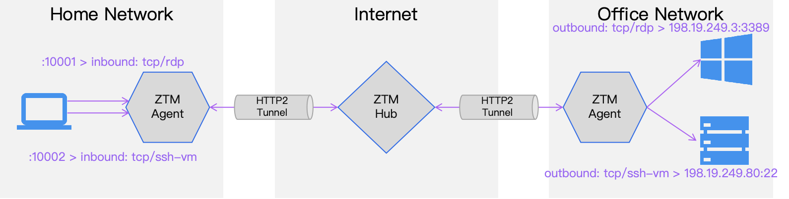 比如这个场景,我们有两个隔离的网络,通过 ZTM 打通组成了一个 ZTM 网络。在我们的办公网络中有两台设备:Windows 设备支持远程桌面访问;Linux 设备支持 SSH 访问。我们称这两个为远端设备。