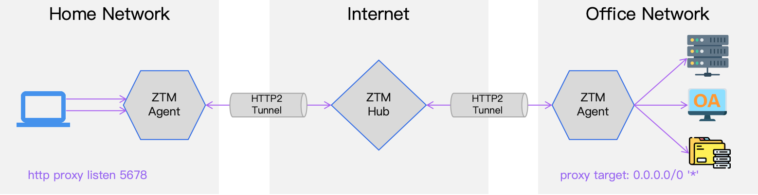 zt-proxy 可以为访问方提供一个 HTTP 或 SOCKS 代理,在目标网络的 ZTM Agent 上,我们只需添加代理的目标地址(可以是 IP 网段,也可以是带有通配符的域名),完成。在访问方只需要目标的 IP 地址或者域名,通过代理即可访问目标设备了。