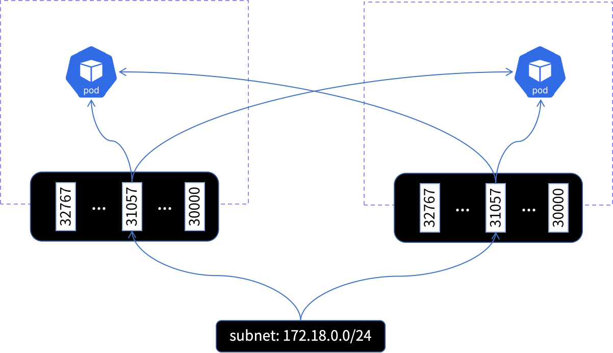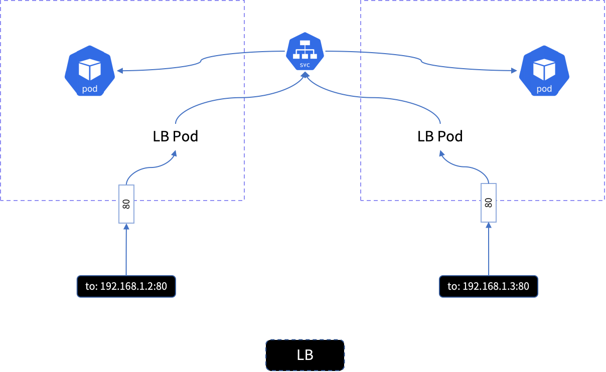 这种实现方式的优点是轻量级,不需要依赖云供应商的负载均衡器,成本低,简单易用,非常适合网络和资源受限的场景;缺点也明显,全节点监听端口,缺乏 TLS 终止等高级功能,转发需要节点网络高并发场景下成为瓶颈。