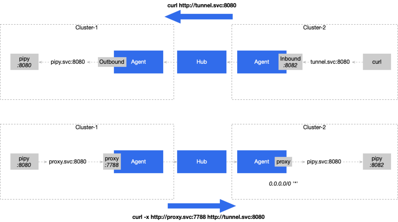 然后通过集群外部 Agent 的代理来访问集群内部服务了,比如 curl -x http://192.168.1.30:8080 http://svc-a.svc:8080。
