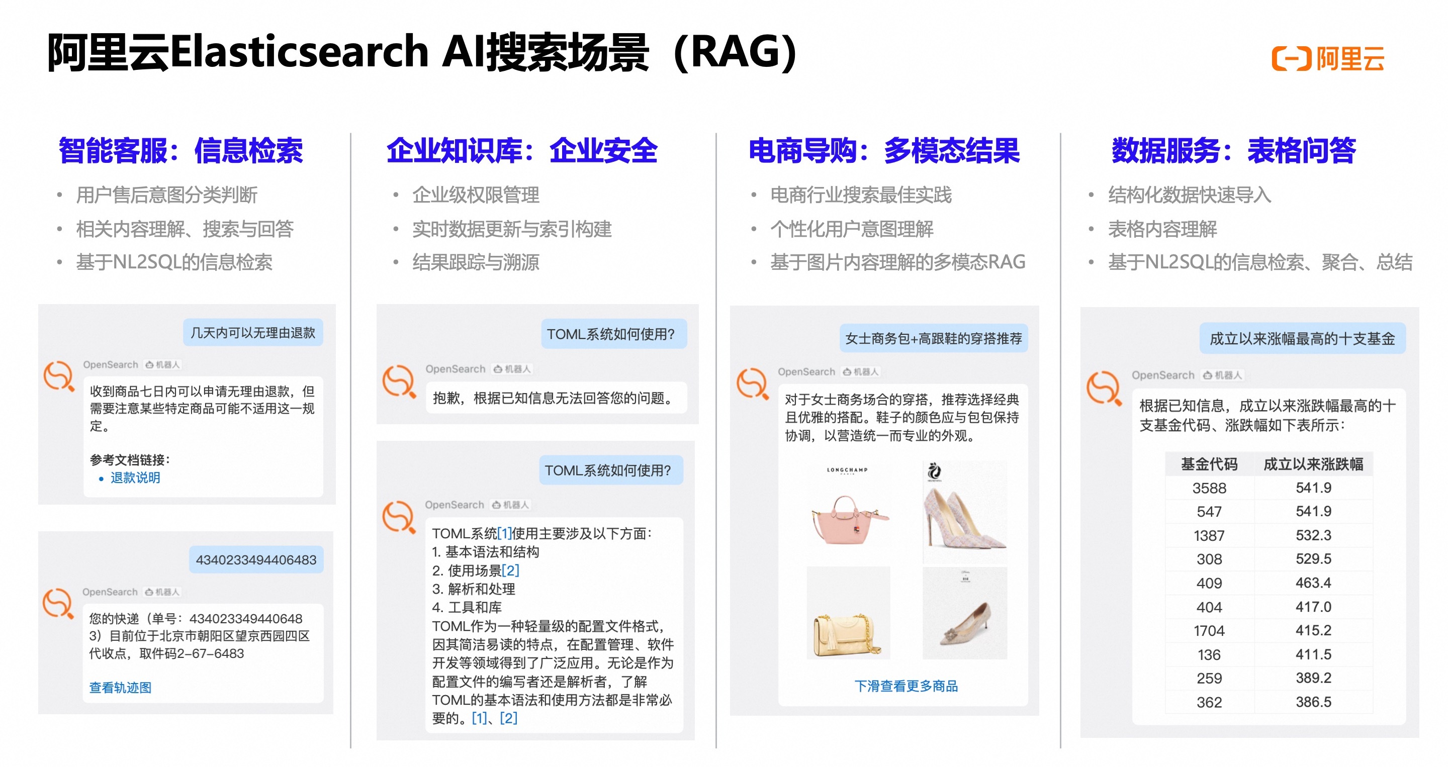 在搜索场景(RAG)方面,阿里云的 ES 可以广泛应用于以下几个场景: