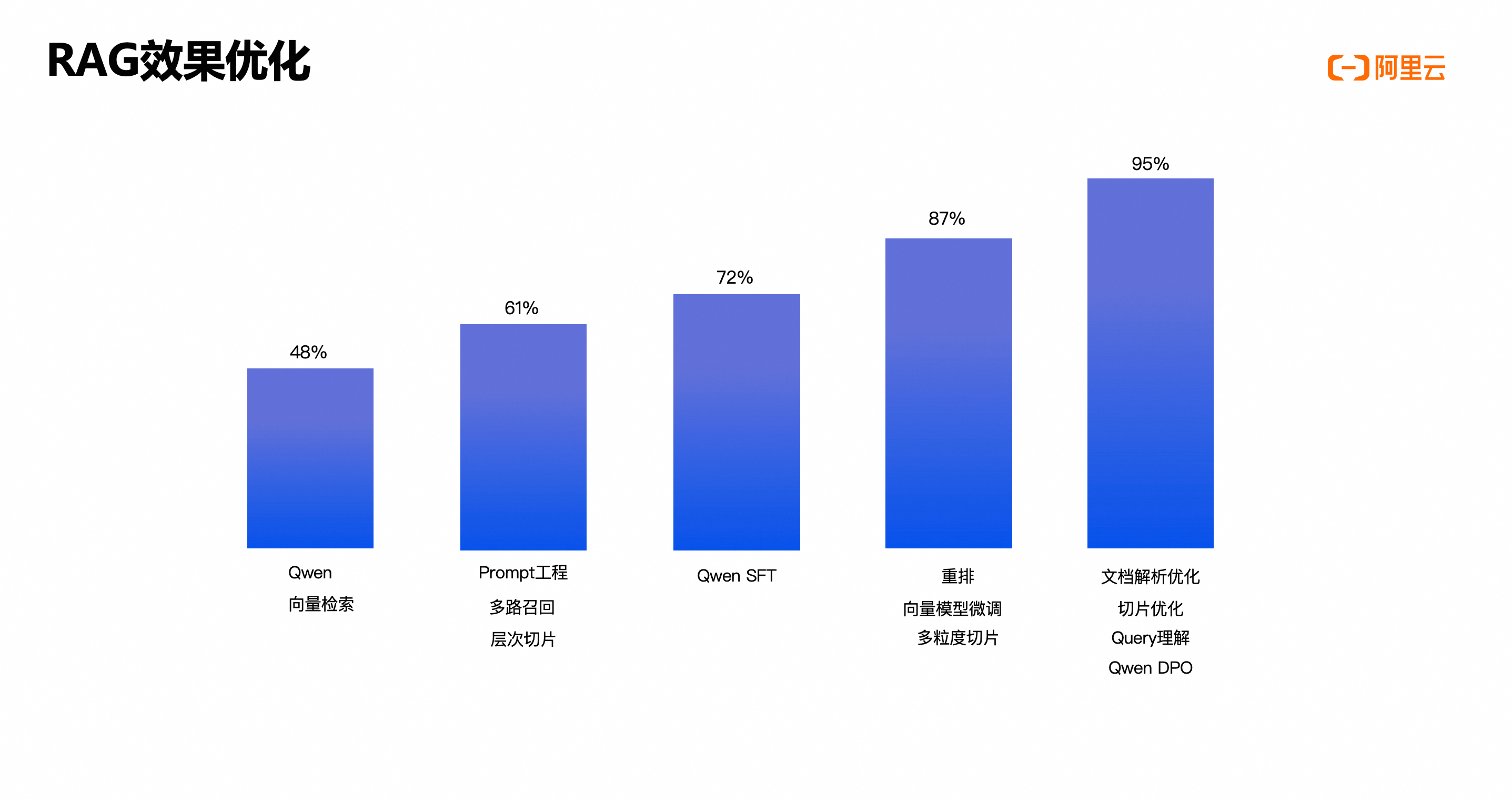 阿里云和很多客户做过线上或者是线下的交流。客户有些场景下,既要 AI 的这个交互式的能力,又要保证这个结果的百分之百准确,不能引入任何大模型的幻觉,不能让大模型做任何的胡编乱造。我们是引入搜索链路,在保证准确性的情况之下,我们能够应用到这个 AI 的能力进行一个完整的交互。至于具体的效果优化如下: