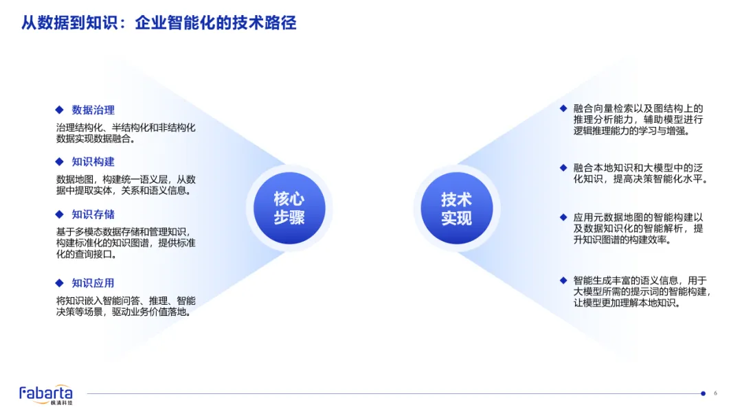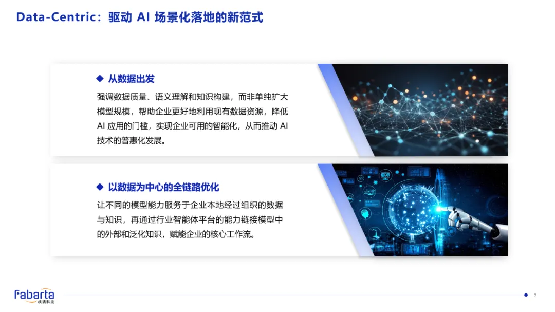 相反, "以数据为中心"则是不一样的架构,关注的是企业本地的数据,并将其转化为可用的知识。 当然,这种转化也是通过智能的方式来构建。当我们需要使用大模型或多模态大模型去做内容理解的时候,就用它去做内容理解;需要给它足够的 Prompt 生成一长段内容的时候,我们就用它去做内容生成;当需要对结构化数据进行简单的数理分析时,可以用非常传统的数据分析的方法去做结构化的数据分析。这种以本地数据知识化为核心的架构,是企业级人工智能场景落地的有效范式。这种方法已经在多家大型的头部企业进行过验证,是一种能够快速将人工智能的技术应用在企业决策场景中的典型范式。