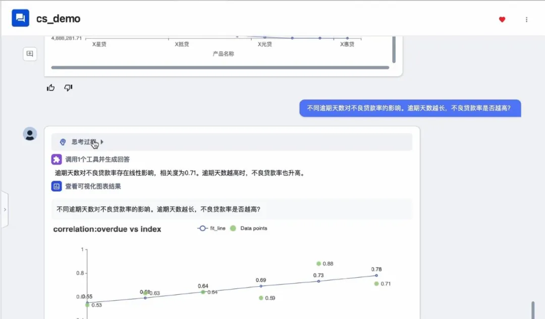 上面这张图展示的是我们为一个金融客户开发的智能指标系统。当用户查询不良贷款相关指标时,系统能够智能搜索并生成不良贷款指标数据及对比。当用户询问不良贷款指标的后续影响时,系统会直接呈现深度影响分析及解释逻辑。系统还集成了智能体工具。例如,当用户询问"A越高,B是否越低"等相关性问题时,智能体会调用相关性分析算法工具,给出相关性和相关系数。