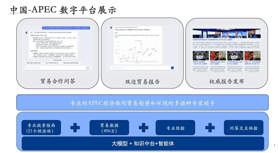 在 APEC 多国贸易领域,有非常多的结构化数据和非结构化的贸易相关的交易数据。我们把这些数据整合到企业的本地知识体系当中,可以开放给 APEC 成员国企业。帮助 APEC 成员国的企业查找上下游渠道商。系统还能智能生成贸易分析报告、风险投资回报比等详细信息,帮助企业决策出口产品到哪个 APEC 成员国能带来最大收益,以及在特定国家进行何种类型的贸易。