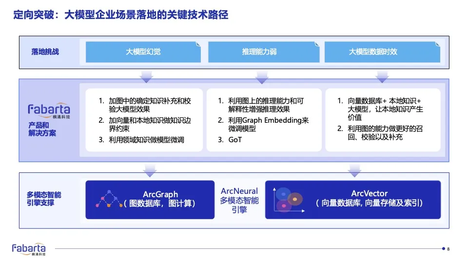 下图展示了我们如何通过图、向量融合等技术,有效地解决了大模型幻觉、推理能力弱以及大模型数据时效性等问题: