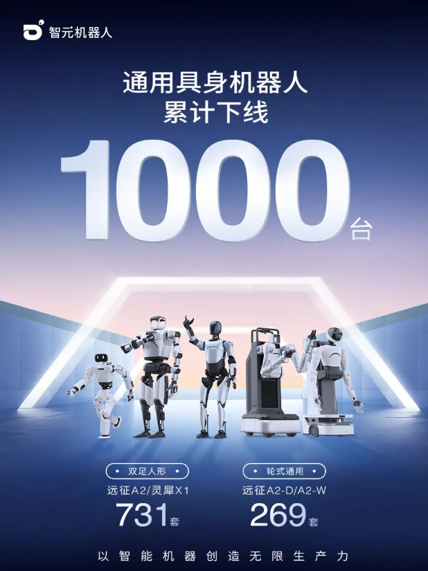智元机器人官宣,其量产的第 1000 台通用具身机器人于 2025 年 1 月 6 日正式下线,其中双足人形机器人远征A2/灵犀X1为731套,轮式通用机器人远征A2-/A2-W为269套。目前,这些机器人正在陆续交付客户中。