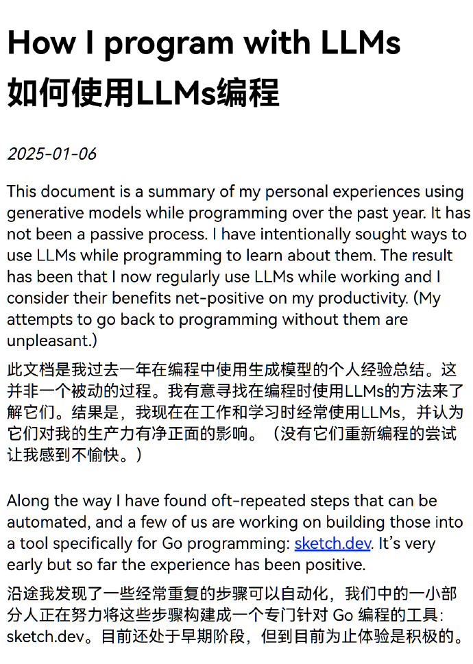 David Crawshaw(Tailscale 公司的创始人)介绍了他用大型语言模型编程的一些经验。