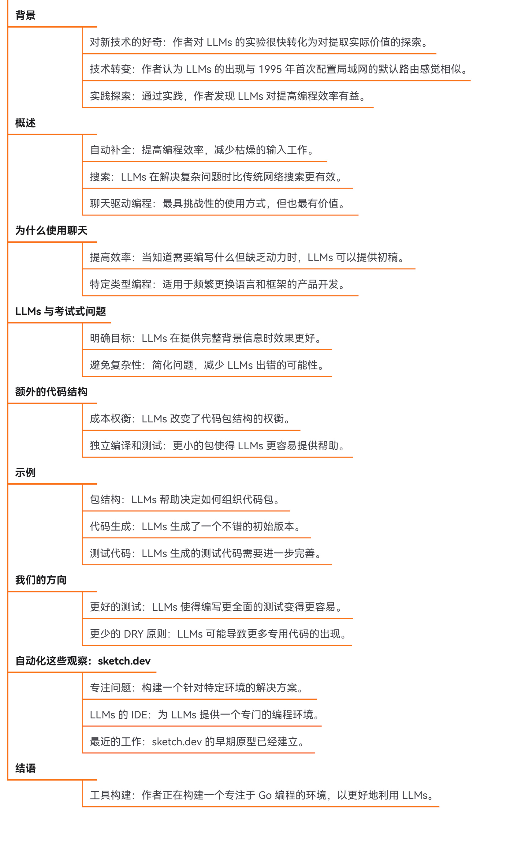 作者强调,LLMs 在编程中的应用不仅仅是提供代码片段,更是一种新的编程范式,需要程序员学习如何与之合作。他还提到,LLMs 在处理复杂的编程任务时,尤其是在编写测试和处理编译器错误方面,可以提供宝贵的帮助。