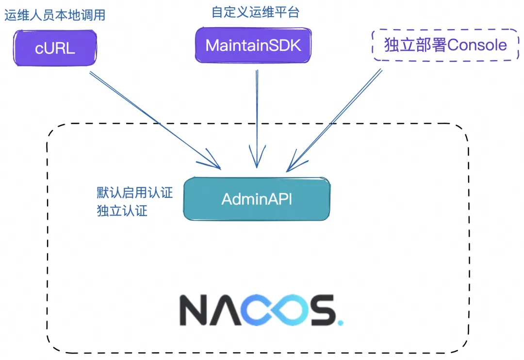 在 Nacos 的早期版本中,AdminAPI 主要面向运维人员,专注于 Nacos 集群的维护操作。由于当时的设计场景多以人为本地调用为主,因此 AdminAPI 的定义较为随意,导致其安全性和标准化程度不足。这使得后续的控制台在复用 AdminAPI 时面临困难,同时也给希望开发自定义控制台或构建管理平台的开发者带来了挑战。