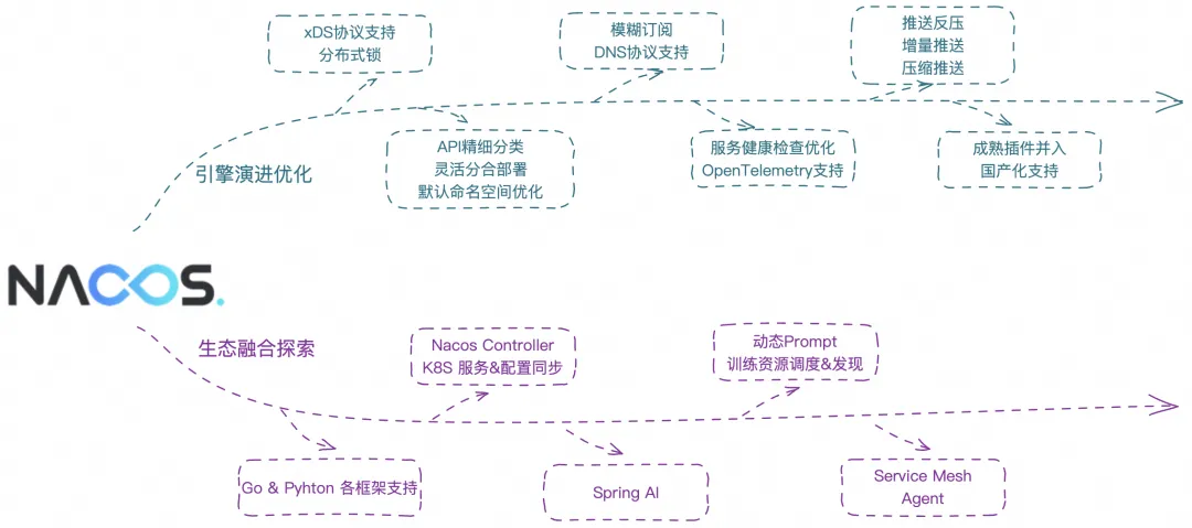 在生态建设方面,我们将通过 Nacos Controller 的快速迭代,实现 Kubernetes 服务与配置的同步管理,从而使云原生环境下的使用变得更加便捷。此外,我们将积极探索多语言生态与 AI 大模型的集成,通过支持多语言应用框架以及 Spring AI 和其他 AI 大模型开发框架的动态 prompt 发现和资源发现,为用户提供更加丰富的功能选择与应用场景,努力构建一个高效、灵活的分布式协调平台。