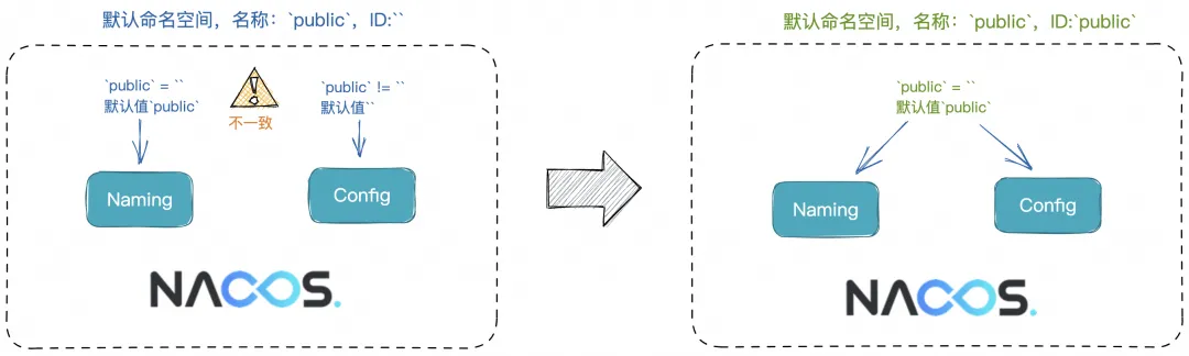 在 Nacos 中,命名空间 ID 是命名空间的唯一标识符。然而,许多用户在使用默认命名空间 public 时,错误地将名称"public"作为 ID 配置到应用程序中,这导致了一些问题。同时,其他正常使用此命名空间的用户对默认命名空间 public 的 ID 为空字符串''感到困惑。这种困惑源于服务发现模块可以使用 public 作为命名空间 ID 并将其视为默认处理方式,而在配置管理模块中却并非如此。简而言之,默认命名空间 ID 的处理方式存在不一致性。