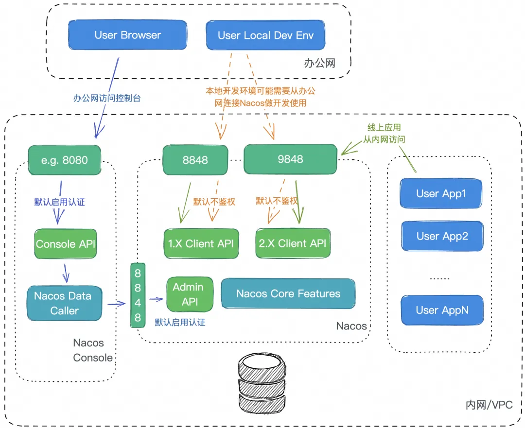 在之前的 Nacos 版本中,为了方便用户的部署和使用,控制台与引擎程序一直合并部署,且共用同一个端口。这种方式虽然增强了使用的便利性,但也带来了一些安全风险。此外,由于控制台和引擎在使用场景上存在差异,它们对于开放网络访问范围及安全认证需求的预期也不尽相同。基于此,Nacos 计划在新版本中对控制台和引擎的部署架构进行较大调整。