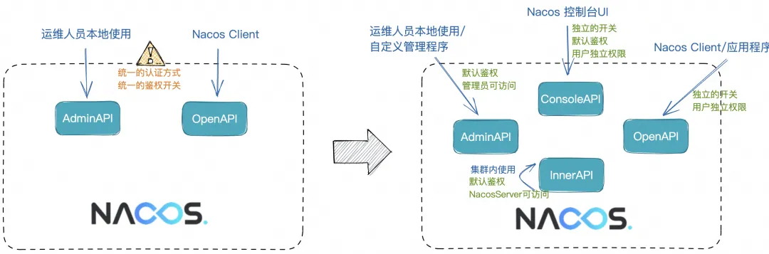 在 Nacos 3.0 之前,所有 API 都采用统一的安全认证方式,这对于 InnerAPI 和 AdminAPI 等主要用于内部调用的 API 来说并不适合。此外,由于所有 API 的安全认证采用同一个开关,导致在客户端和应用程序完成身份设置之前无法开启安全认证,从而带来了更高的安全风险。