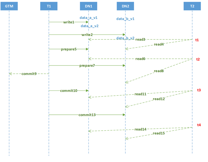 4)T2事务在t4,同时发起向DN1和DN2的读操作(对应read14和read15),DN1返回data_a_v2,DN2阻塞到commit13消息后返回data_b_v2,两个都是V2版本,所以,此时T4读取的数据是一致的。