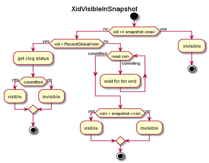 如果读取的xid对应的CSN已提交,并且CSN < snapshot.CSN,那么数据对当前事务是可见的。