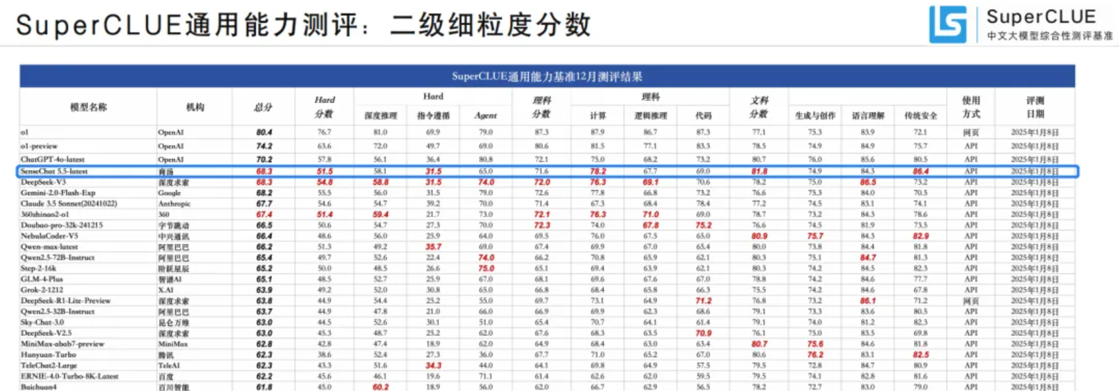 根据国内大模型测评机构SuperCLUE最新发布的《中文大模型基准测评2024年度报告》:商汤“日日新”融合大模型以总分68.3的成绩,与DeepSeek V3一起并列国内榜首。