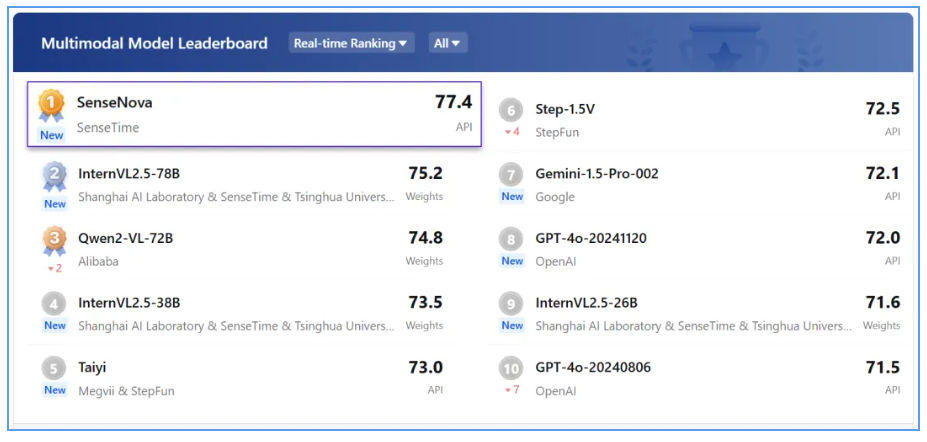 在近期另一个权威综合评测机构OpenCompass的多模态评测中,商汤以同一款模型同样取得了榜单第一,分数大幅领先GPT-4o。