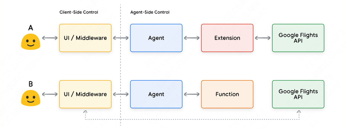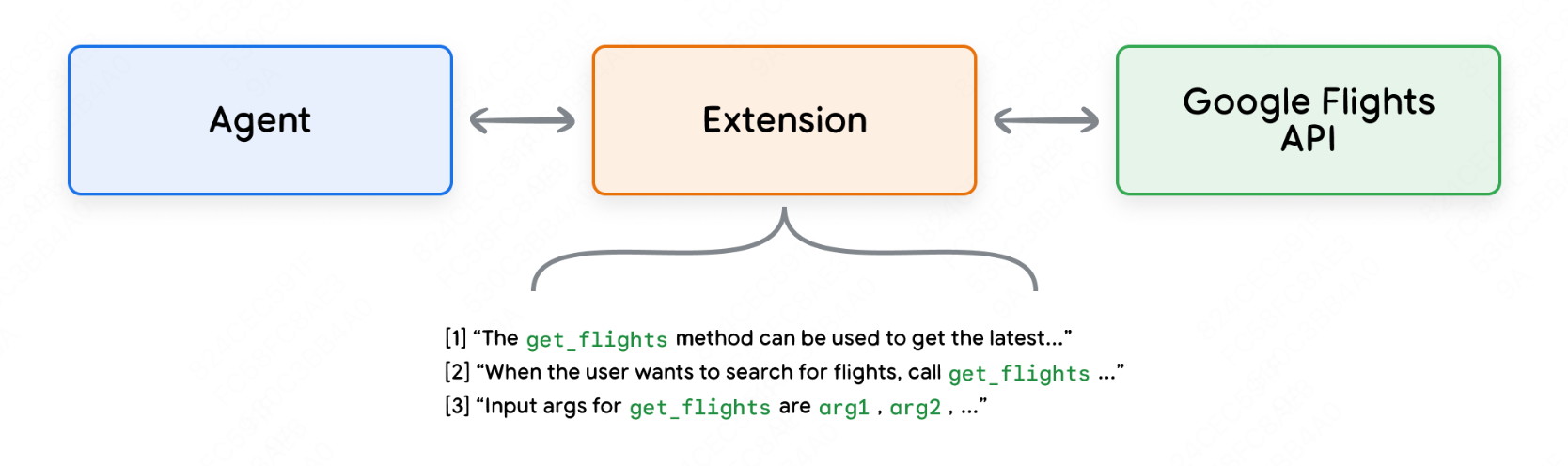 理解扩展的最简单方式是将其视为以标准化方式弥合API与代理之间的差距,使代理能够无缝执行API,无论其底层实现如何。假设你构建了一个旨在帮助用户预订航班的代理。你知道你想使用谷歌航班API来检索航班信息,但你不确定如何让代理调用这个API端点。