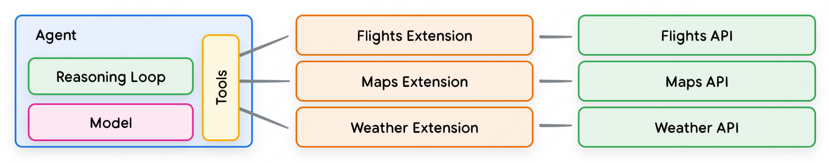 1、扩展 (Extensions):桥接 API 和智能体之间的鸿沟,使智能体能够无缝执行 API。