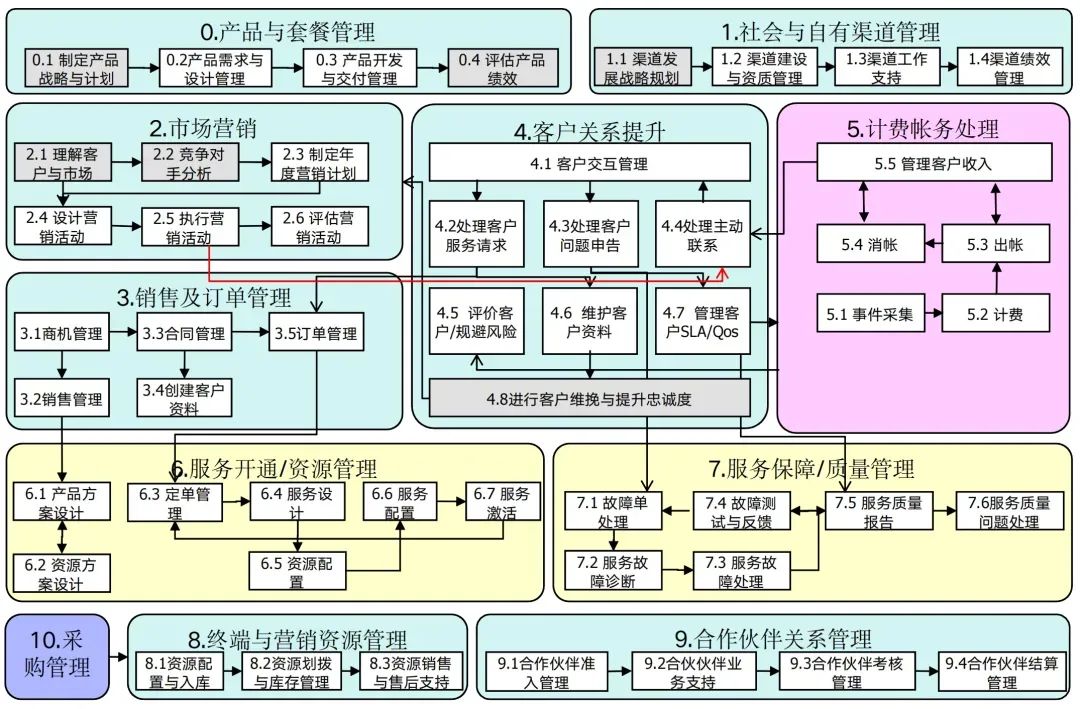下图就是中国电信CRM 2010年的一个流程整理版本,是一个相对抽象的角度,讲清楚了中国电信的客户管理系统要干什么。