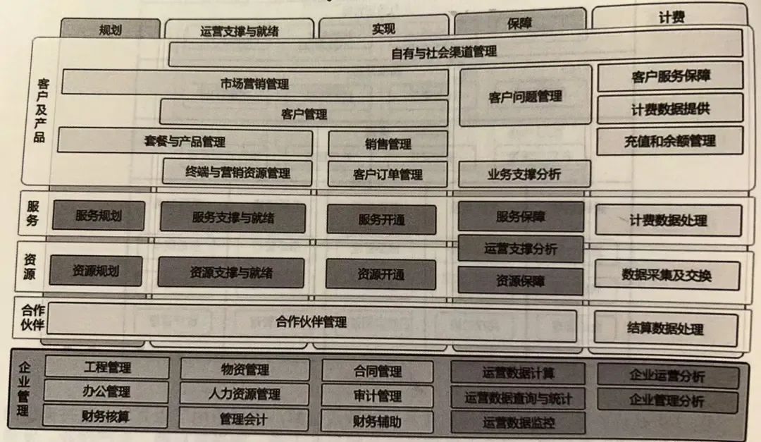 继续进一步,将价值流阶段(纵)和一些功能主题(横)组合在一起的时候,就从一个比较高的层次,描述了企业要做哪些阶段的事,每个阶段需要哪些能力支撑,下面就是一本书中对上面电信系统的描述。