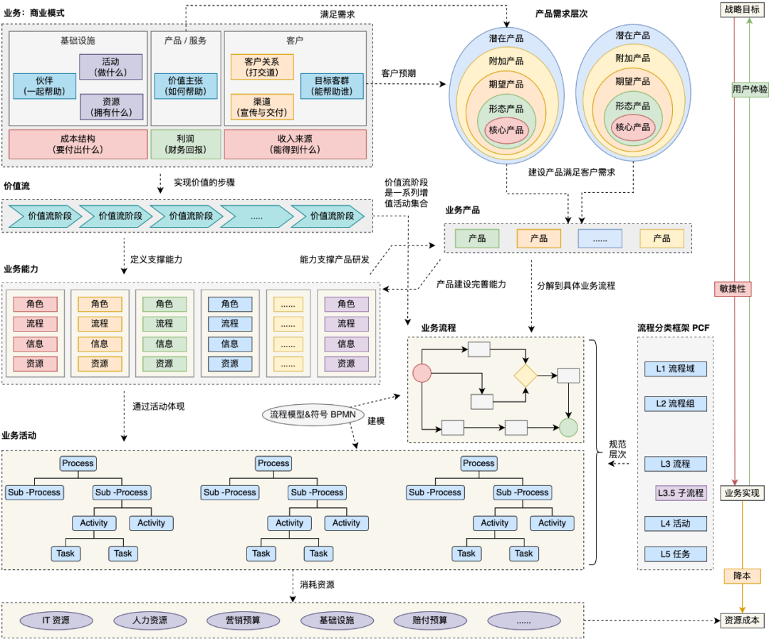 业务架构其实是为了“塑造一面镜子”,让企业看清自己。下面是本人之前梳理的一个整体逻辑图。从顶层的商业模式,到中间的业务能力、业务流程,再到具体的系统实现与资源消耗,是一个抽象层面的认知结构。