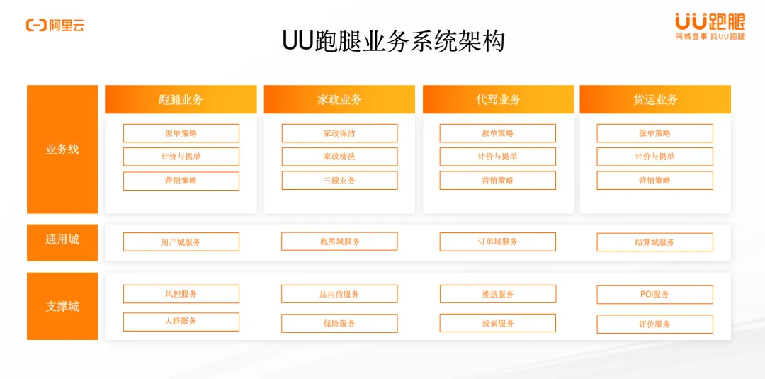 UU 跑腿依托领域模型构建中台战略,借助业务支撑域和通用域的业务复用能力,快速扩展并有效支撑家政、代驾、货运等多业务的发展。各个业务线之间,有共性的,也有差异化。我们对功能性需求进行了抽象,提炼特有业务和公共业务,用领域驱动的概念拆分核心域、通用域和支撑域,我们想给用户提供一条龙的服务。