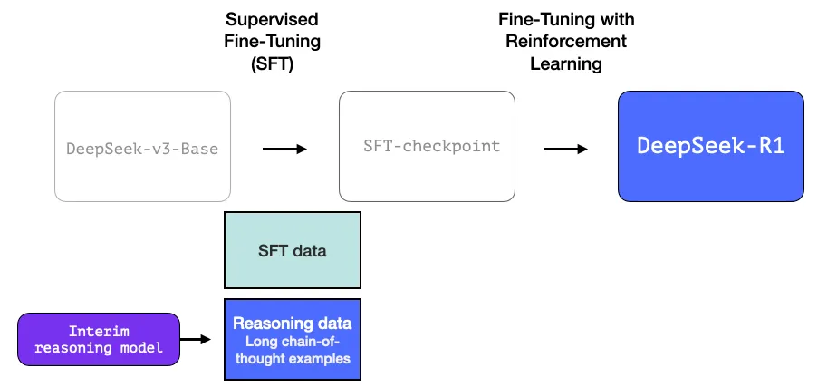 在此过程中,我们利用强化学习(RL)来构建一个临时的推理模型。随后,这个模型被用于生成用于监督式微调(SFT)的推理示例。然而,能够创建这个模型的关键,在于之前的一项实验,该实验成功打造了一个名为 DeepSeek-R1-Zero 的早期模型。
