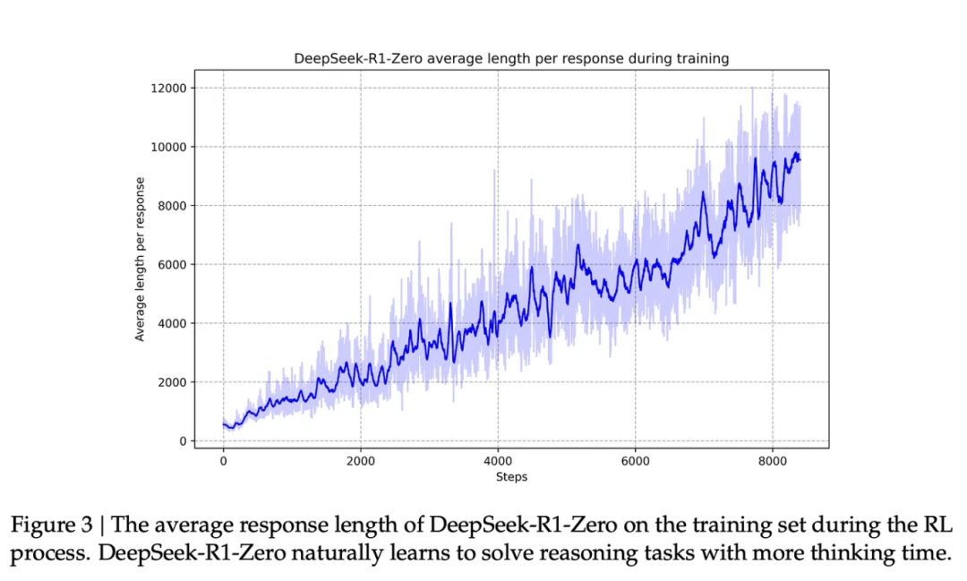 与此能力提升相伴的是,模型生成了更长的响应,即使用了更多的思考 tokens 来处理问题。