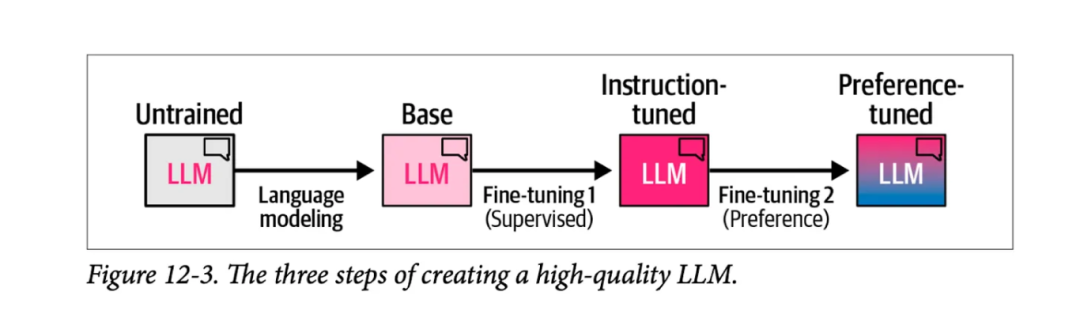 下图摘自书籍《Hands-On Large Language Models》的第 12 章,展示了创建高质量大语言模型的三个主要步骤:
