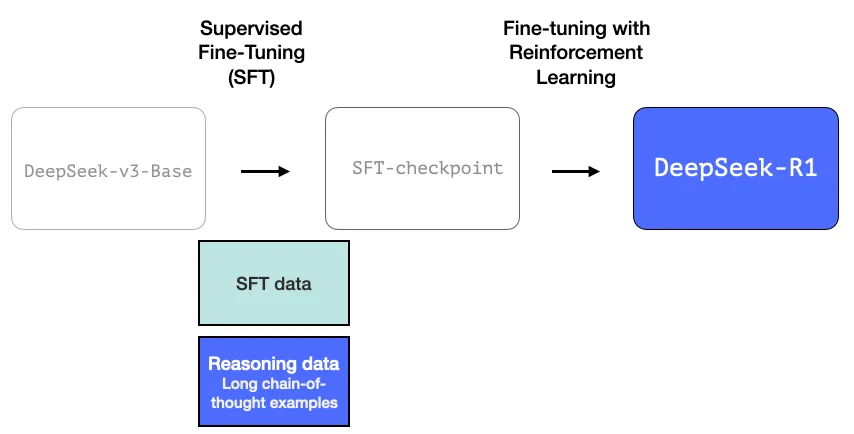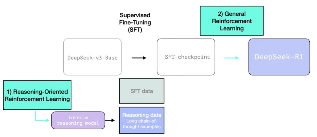 DeepSeek-R1 遵循了这一通用框架。其第一步的具体内容源自于之前关于 DeepSeek-V3 模型的研究论文[1]。R1 使用的是该论文中的基础模型(并非最终的 DeepSeek-V3 模型),并且同样经历了 SFT(监督式微调)和偏好调优阶段,但它的独特之处在于这些阶段的具体操作方法。