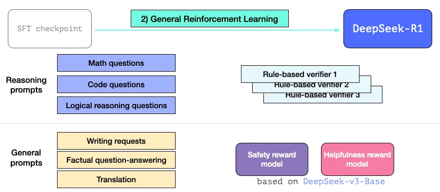 这样,R1 模型不仅在推理任务上表现卓越,还能有效地应对其他非推理类任务。这一过程与我们之前提到的强化学习过程相似,但因为它涵盖了非推理领域的应用,所以它还引入了一个实用性奖励模型和安全性奖励模型(与 Llama 模型有相似之处),用于处理这些应用领域的提示词。