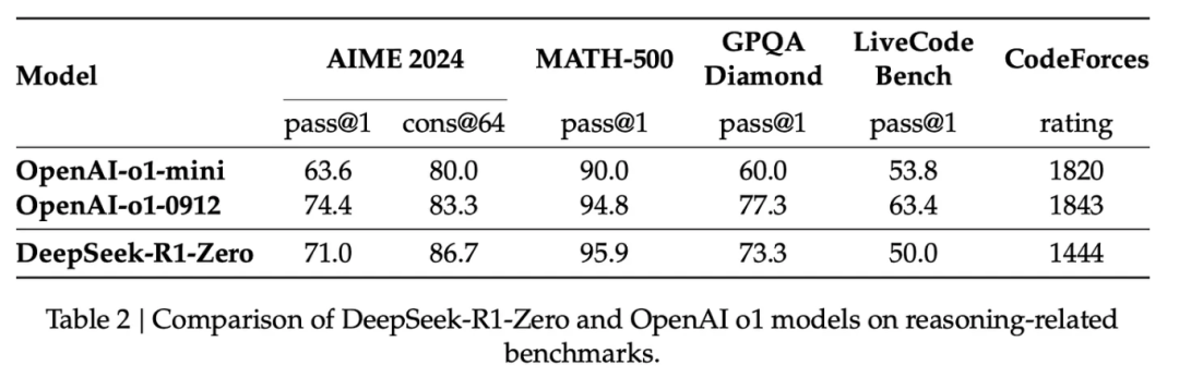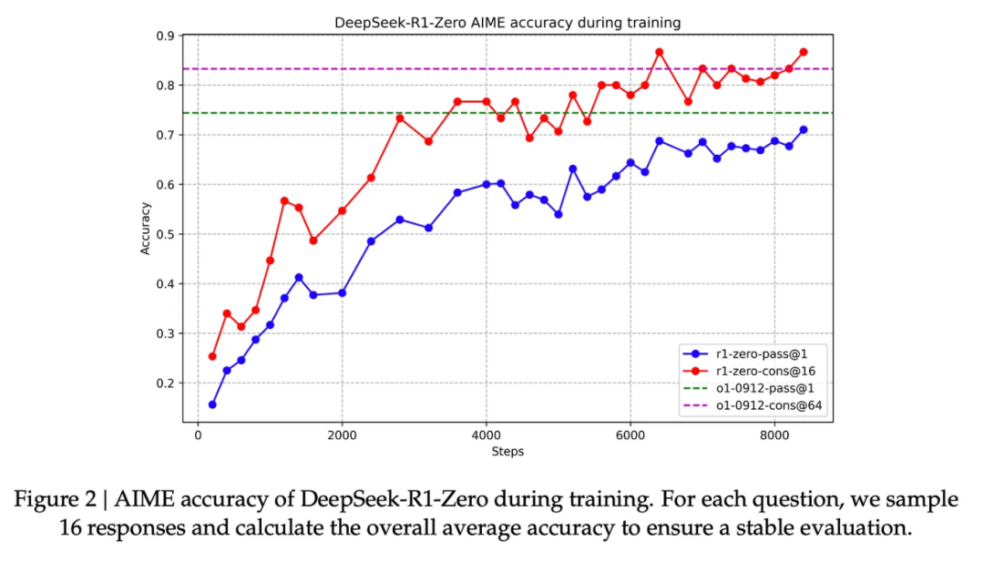 R1-Zero 的独特之处在于,它能够在没有经过标注的 SFT 训练集的情况下,依然在推理任务上表现卓越。它的训练过程直接从预训练的基础模型出发,通过强化学习训练(跳过了 SFT 阶段)。它的表现非常出色,能够与 O1 模型相媲美。