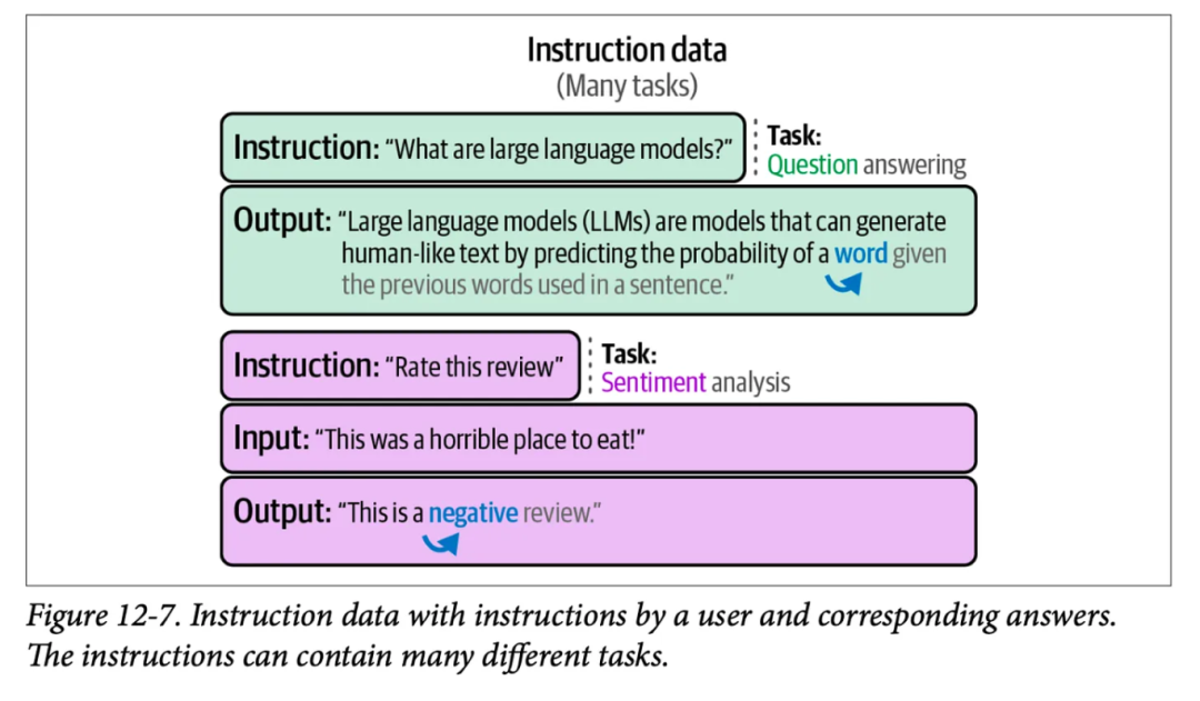 对于监督式微调(SFT)这一概念,可能你还不太熟悉,它是一种训练过程,通过向模型展示形式为提示词和正确补全的训练示例来进行。下面这个图展示了书籍《Hands-On Large Language Models》第 12 章中的一些 SFT 训练示例: