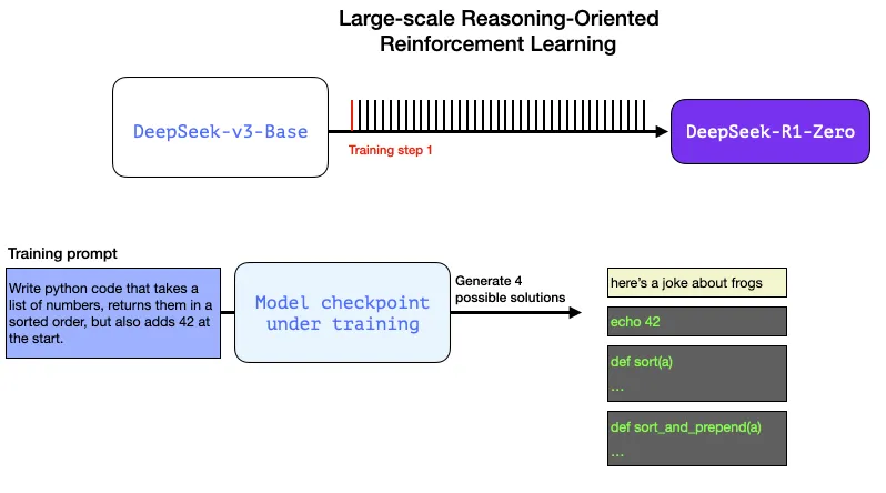 这些数据是由 R1 的前身,一个专注于推理但尚未命名的姊妹模型所生成的。这个姊妹模型受到了另一个模型 R1-Zero 的启发(我们将在稍后讨论)。它之所以意义重大,并不是因为它是一个非常好用的 LLM,而在于在它的创建过程中,几乎无需依赖标注数据,仅通过大规模的强化学习,就能培育出一个擅长处理推理问题的模型。