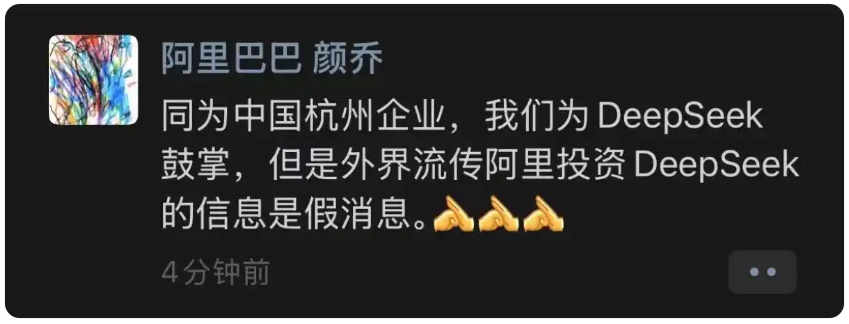 同为中国杭州企业,我们为DeepSeek鼓掌,但是外界流传阿里投资DeepSeek的信息是假消息。