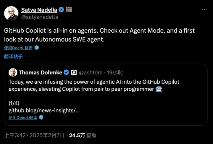 微软 CEO Satya Nadella 昨日在 X 平台发文,宣布 GitHub Copilot 全面接入智能体,并且微软的自主 SWE 智能体也首次亮相。