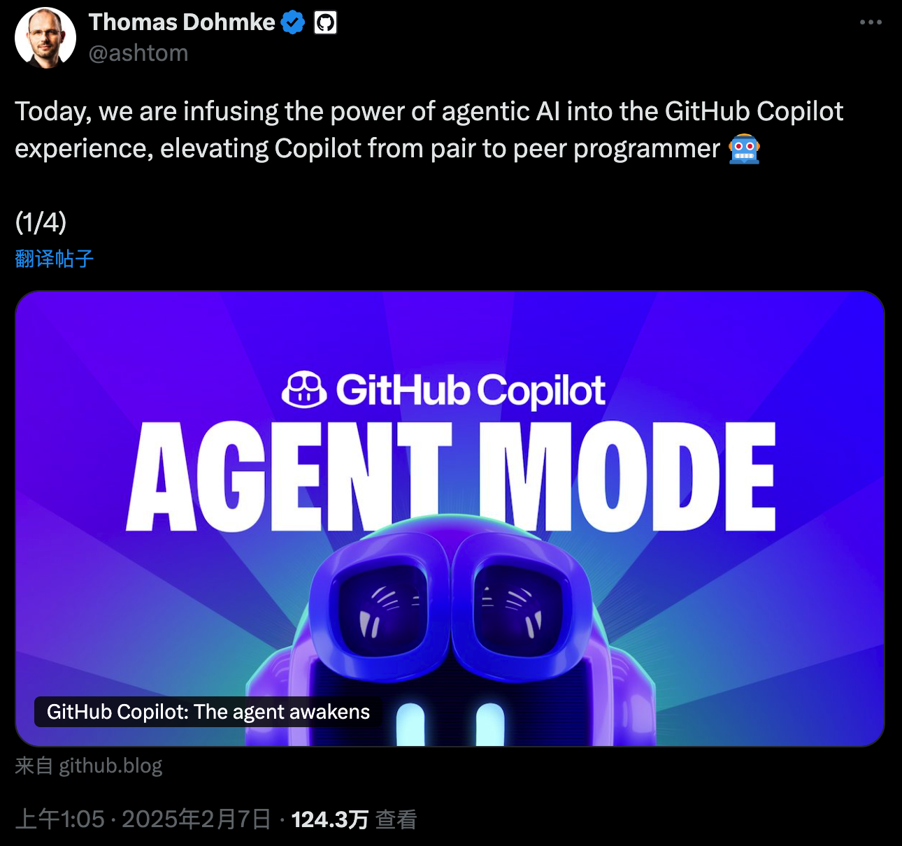 GitHub 现任 CEO Thomas Dohmke 发文介绍了 GitHub Copilot 的主要功能。他表示,GitHub Copilot 的新代理模式能够迭代自己的代码,识别错误并自动修复。